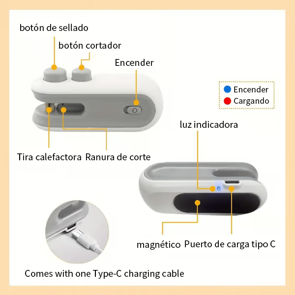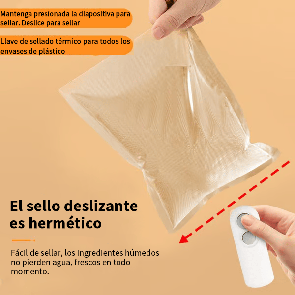Nuestro mini sellador de bolsas te ayuda a conservar las sobras, aperitivos, frutas y mucho más. Es pequeño, pero muy útil. Ayuda a reducir el contacto con el aire para evitar que los alimentos se echen a perder y permite almacenar los alimentos por separado para conservar su sabor original. Con un mini sellador de bolsas, podrás seguir disfrutando de alimentos de alta calidad con total tranquilidad.